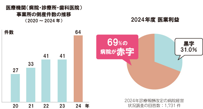 その結果、救急の受け入れや入院の受け入れを制限する病院が相次ぎ、開業医の閉院も起きています。昨年度は64の病院・診療所が倒産し、過去最多となっています。お産ができない市町村も全国で1042市町村を超えています。