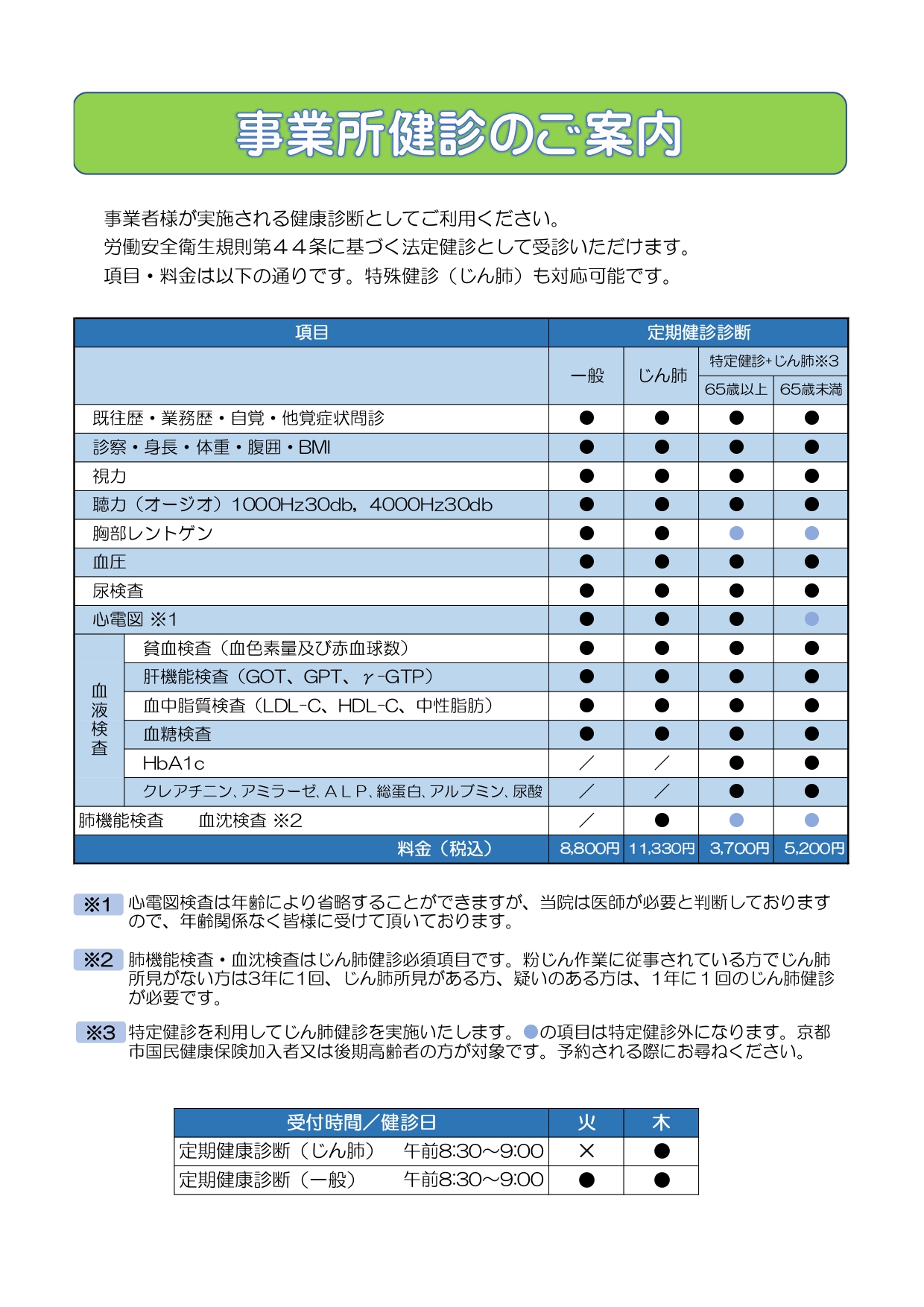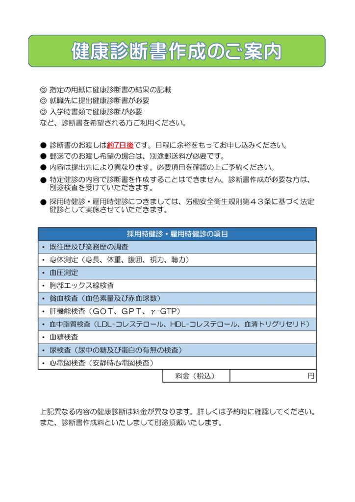 お渡しは来院手渡しか郵送となります。郵送の場合切手代を頂戴いたします。 - ご予約の際に①必要健診項目、②所定用紙の有無について確認させていただきます。